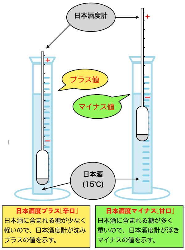 日本酒に含まれる糖が少ないと日本酒度計が沈むので、日本酒度はプラスの値を示します。反対に、糖が多ければマイナスの値を示します。