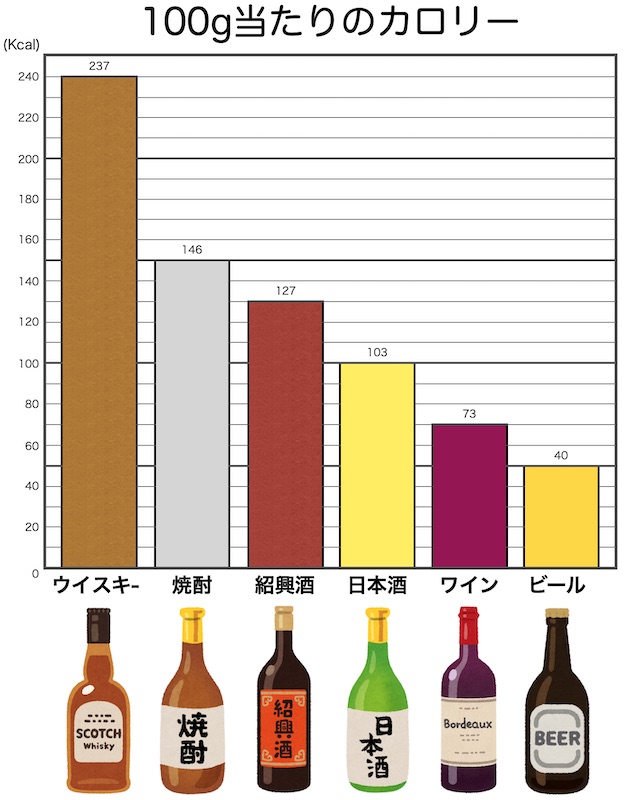 色々なお酒100g当たりのカロリーを比べると、次のグラフのようになります。