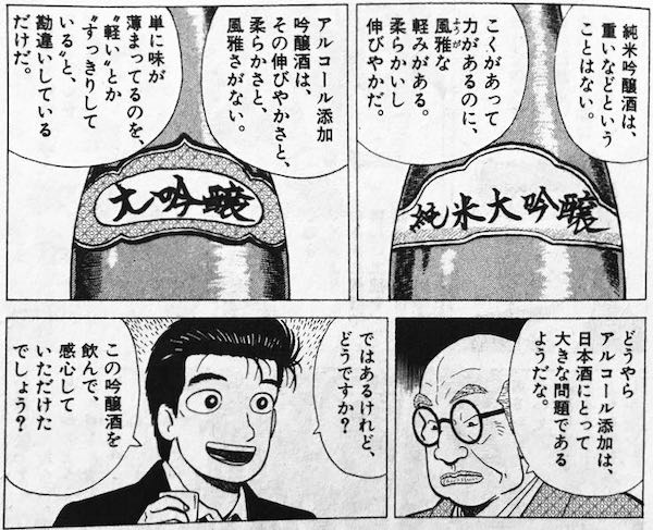 グルメコミックの【美味しんぼ】「季節感たっぷり!秋の夜長に日本酒編」では、純米酒とアル添酒の味の違いを次のように語っています。