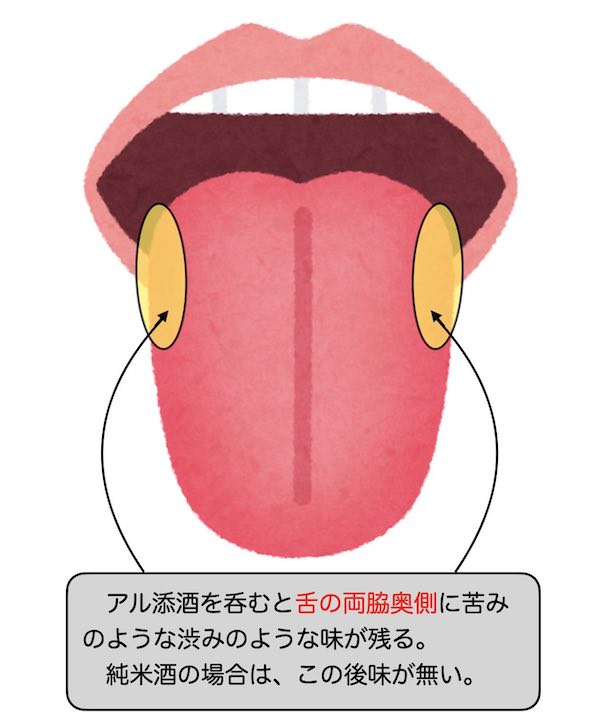 アル添酒を飲むと、舌の両脇奥側に苦みのような渋みのような味が残ります。