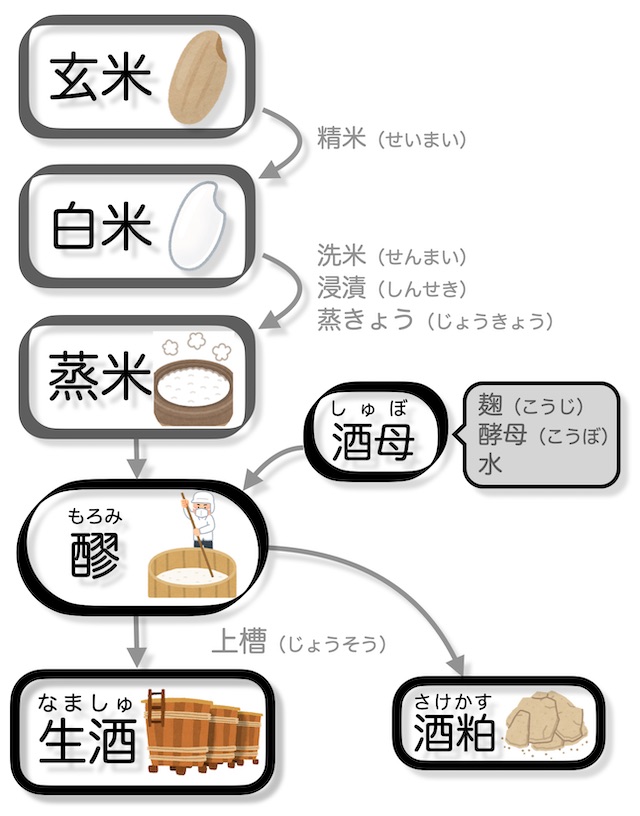 純米酒の製造工程の前半は、玄米から生酒(なましゅ)ができるまでです。