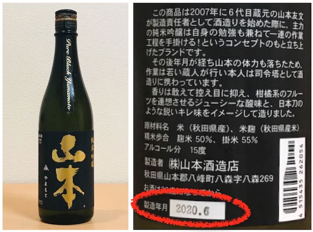 純米酒を含む日本酒には製造年月を表示する義務があるので、裏ラベルには必ず製造年月が書かれています。裏ラベルがないものでは表ラベルに書かれています。