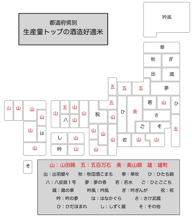 各都道府県で生産量がもっとも多い酒造好適米を、日本地図に書き込みました。