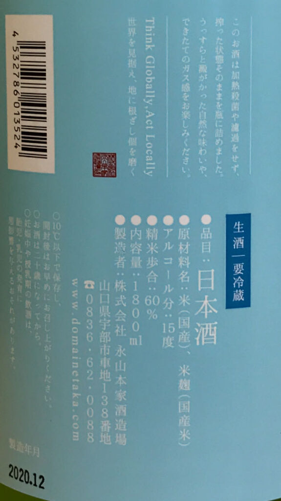 山口県の永山本家酒造場の人気特別純米酒「貴 新酒 直汲」。