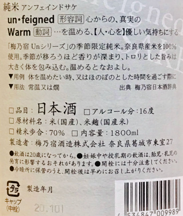 Unfeigned SAKEシリーズはドライやハーヴェストなど6種類ありますが、このお酒は燗酒に適しているので「Warm」(ウォーム)と名づけられたようです。