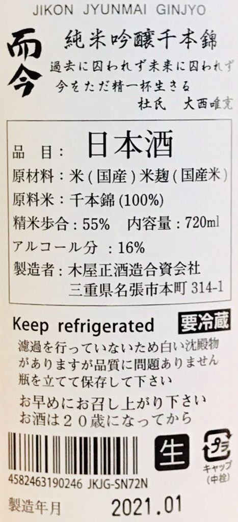 2021年1月、いつもの酒屋さんで購入したこのお酒「而今 純米吟醸 千本錦 無濾過生」は、1,980円(720mL)でした。