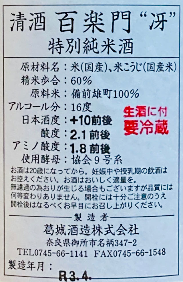 奈良県の葛城酒造の人気特別純米酒「百楽門 冴(さえ)」。