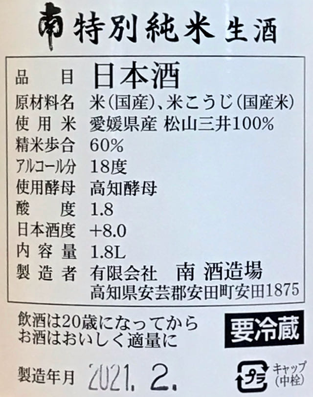 高知県の南酒造場の人気生酒「南 生酒」。特別純米酒好きには有名どころ。